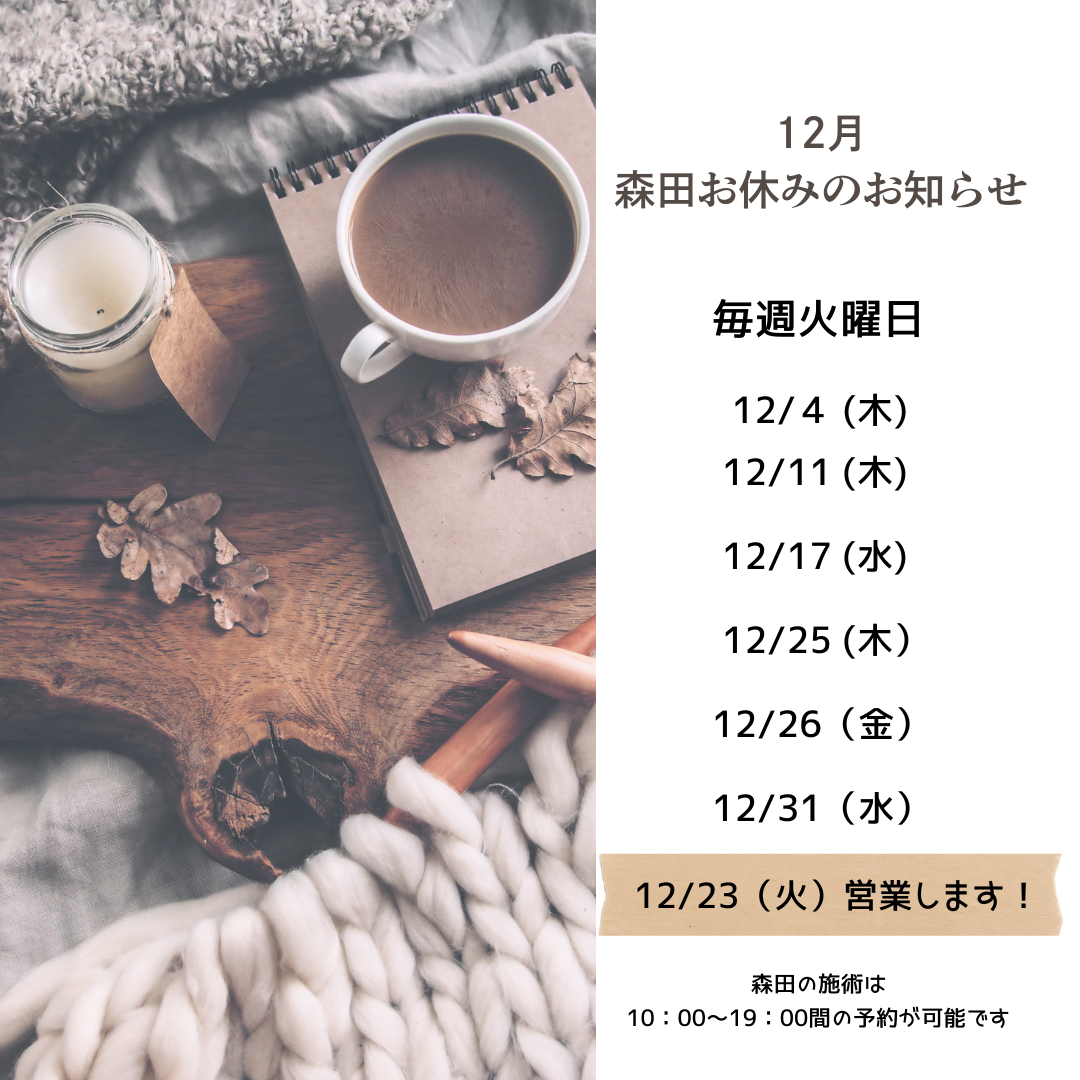こんにちは いつもso/soにご来店いただきありがとうございます! 下記が森田の12月のお休みになります。 森田のご予約は、10:00~19:00の間になります…
