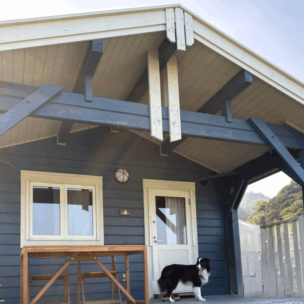 ここは犬OKのロッジがあって、目の前にお庭、その向こう側にドッグランがある素敵なキャンプ場です