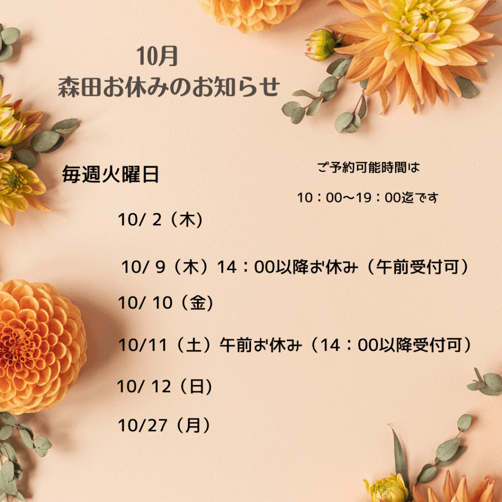 こんにちは いつもso/soにご来店いただきありがとうございます! 遅くなってしまい申し訳ございません。 下記が森田の10月のお休みになります。 10/9、10…