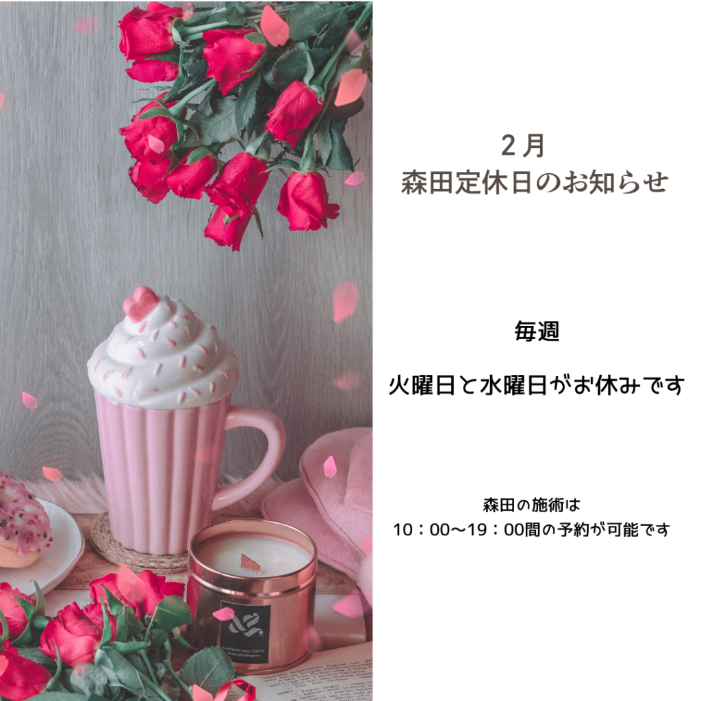 こんにちは いつもso/soにご来店いただきありがとうございます! 下記が森田の2月のお休みになります。 森田のご予約は、10:00~19:00の間になります。…